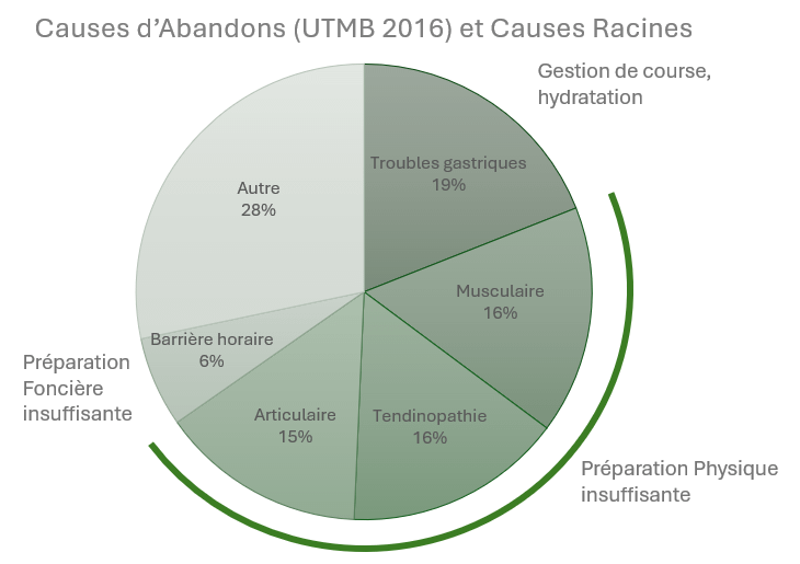 Avec pour origine un manque de préparation physique, , des chaussures inadaptées ou une technique de course perfectible. C’est la première cause d’abandon! Le jour de la course, lorsque la fatigue altère la vigilance et la proprioception, le manque de préparation ne pardonne pas.